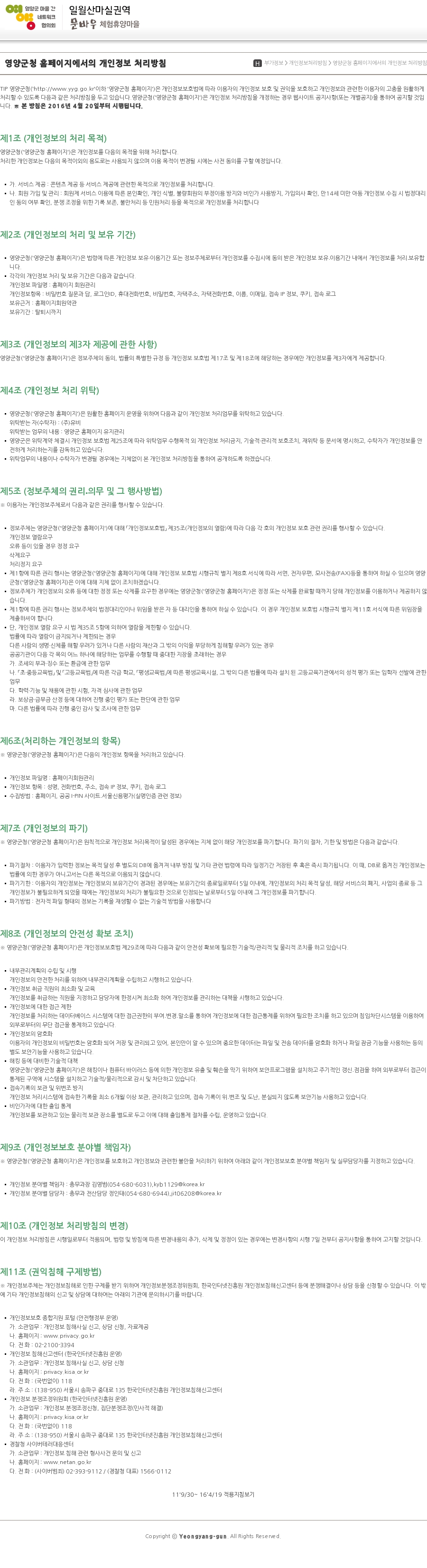 - 영양군청('영양군청 홈페이지')은 법령에 따른 개인정보 보유·이용기간 또는 정보주체로부터 개인정보를 수집시에 동의 받은 개인정보 보유․이용기간 내에서 개인정보를 처리․보유합니다.